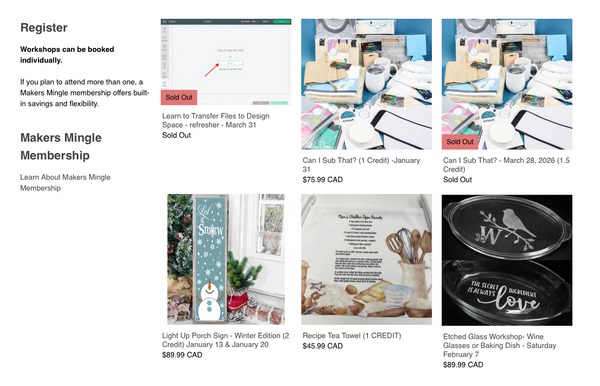 Workshops can be booked individually, while the Makers Mingle membership is for those who want to attend regularly, get great perks, and save. Membership offers credits you can use toward workshops throughout the year.